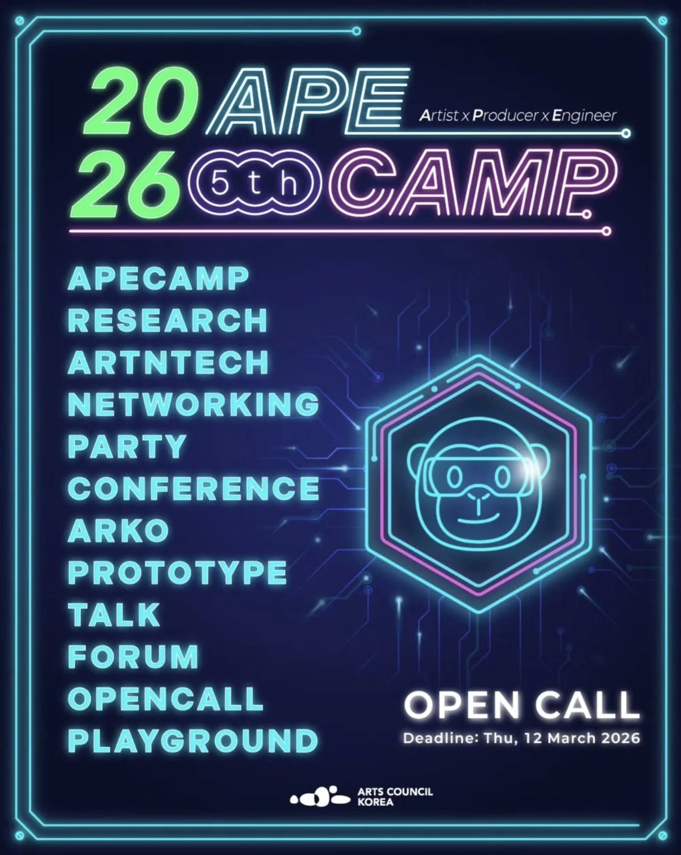 Arts Council Korea (ARKO) invites artists, producers (curators), and engineers aged 39 or under from around the world to APE CAMP 2026.