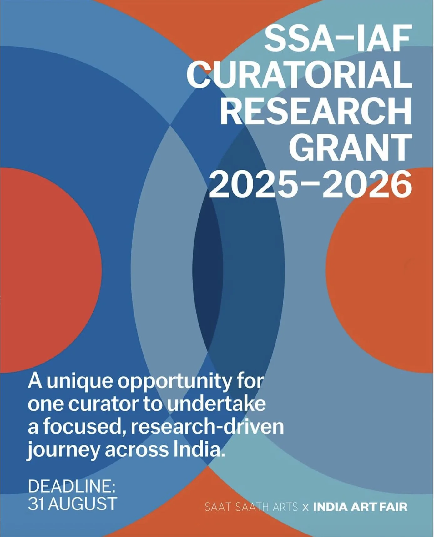 This grant is a new initiative that invites one curator annually for a fully funded research visit to India. Conceived by Saat Saath Arts Foundation (SSA), in partnership with India Art Fair (IAF), the grant is designed for curators who are at a pivotal moment in their practice, where critical exposure to new contexts, access to diverse artists and institutions, and time for immersive fieldwork can help seed future collaborations, exhibitions, or texts.